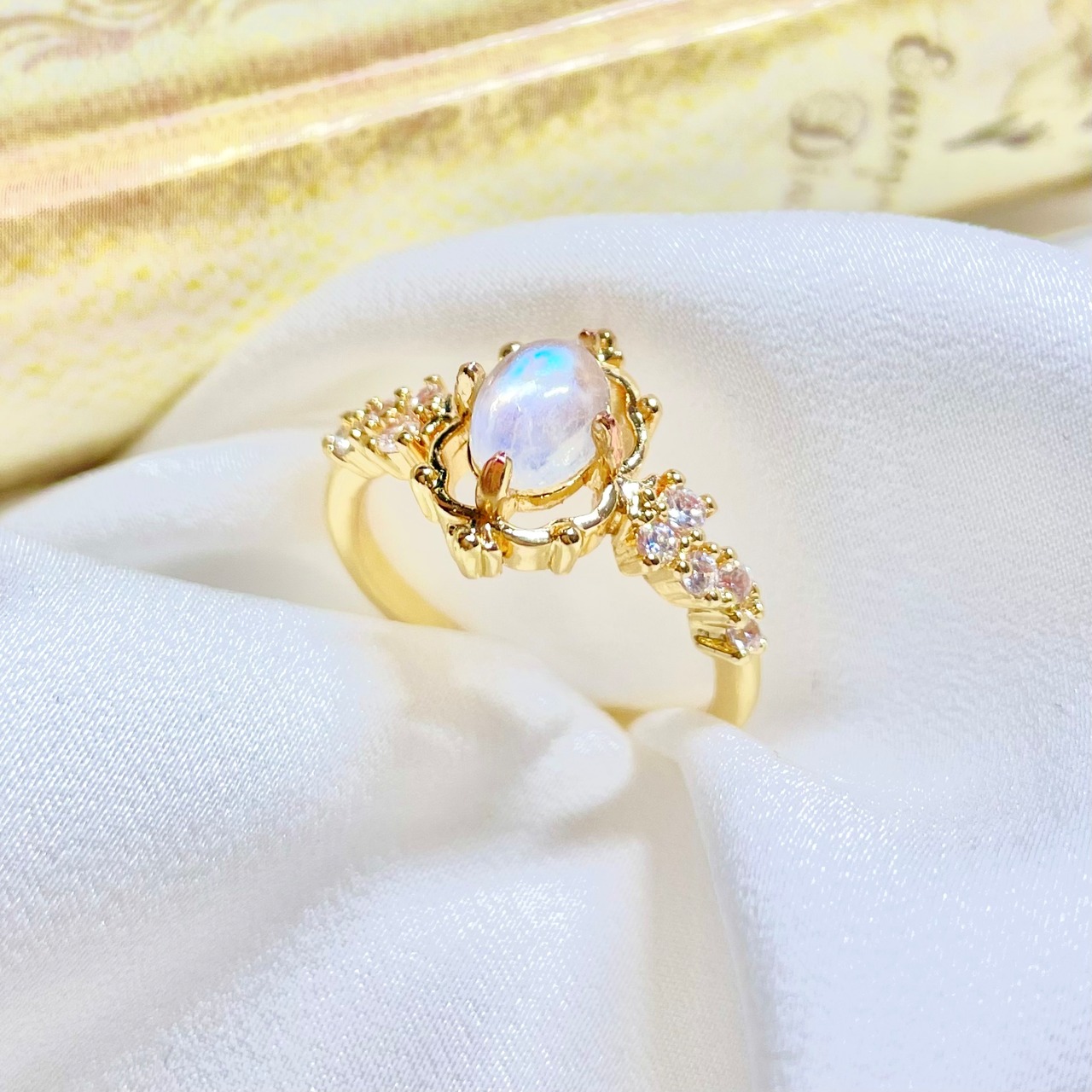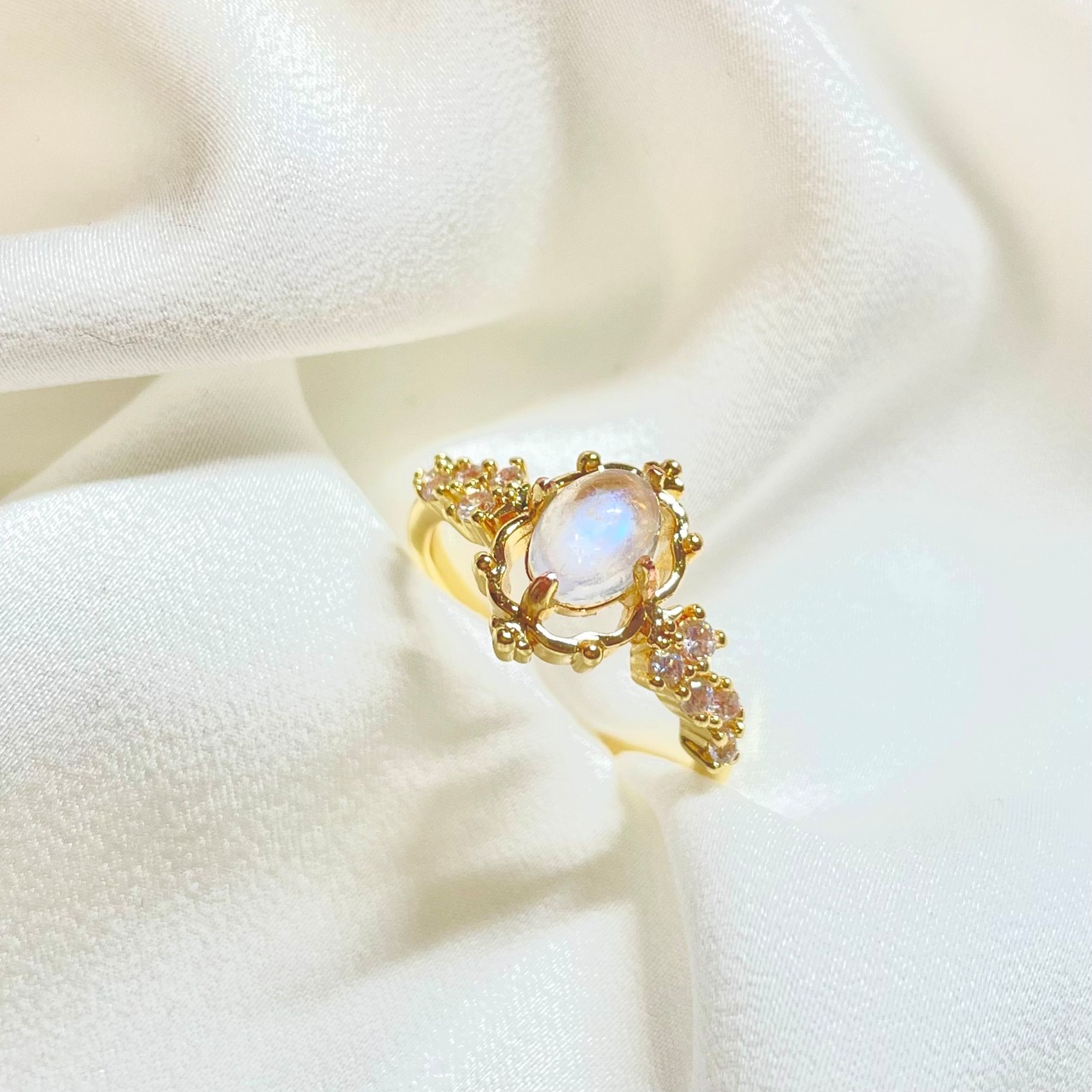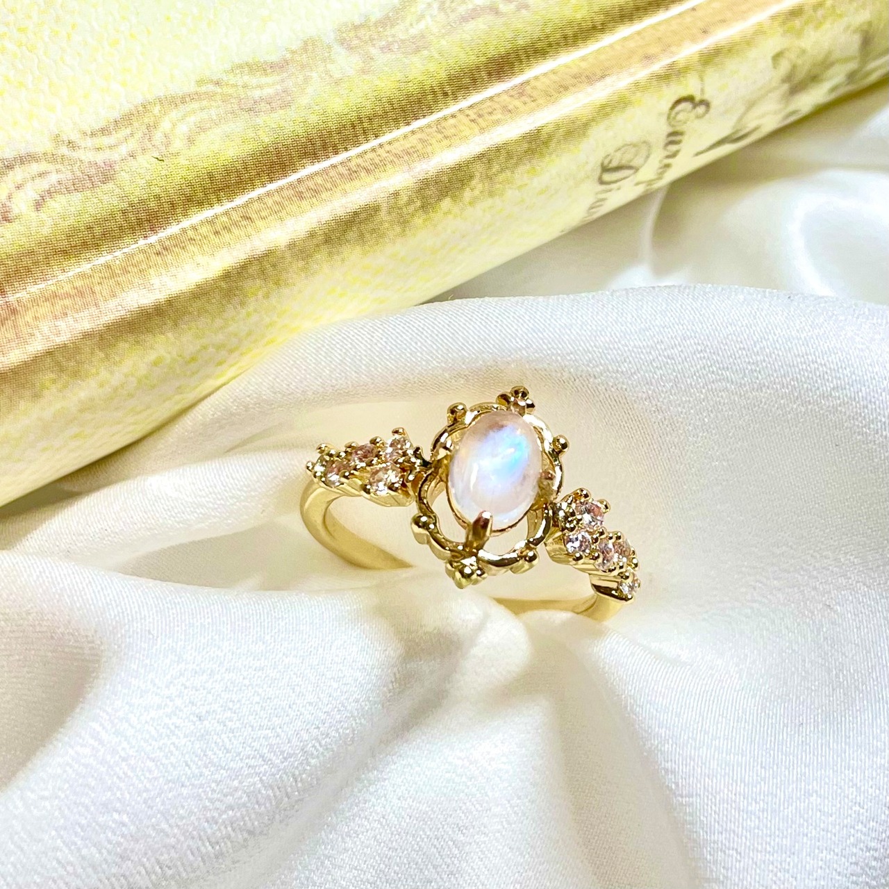 中央で淡いブルーの光を放つブルームーンストーンが、やさしい雰囲気とロマンティックな存在感を放ちます。