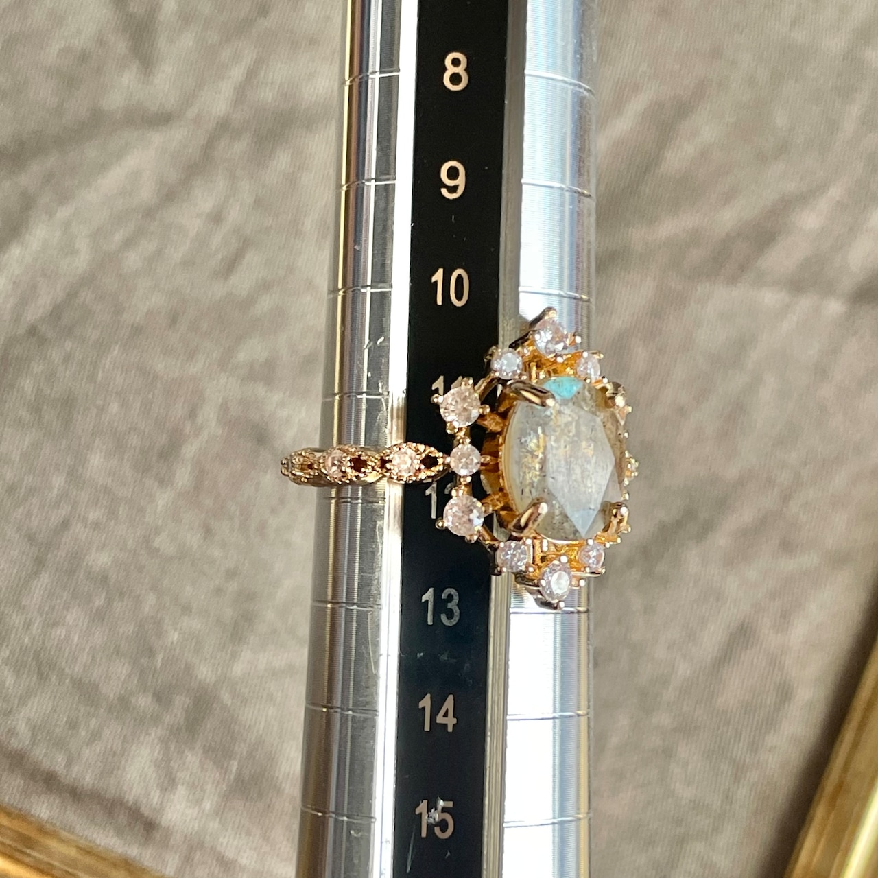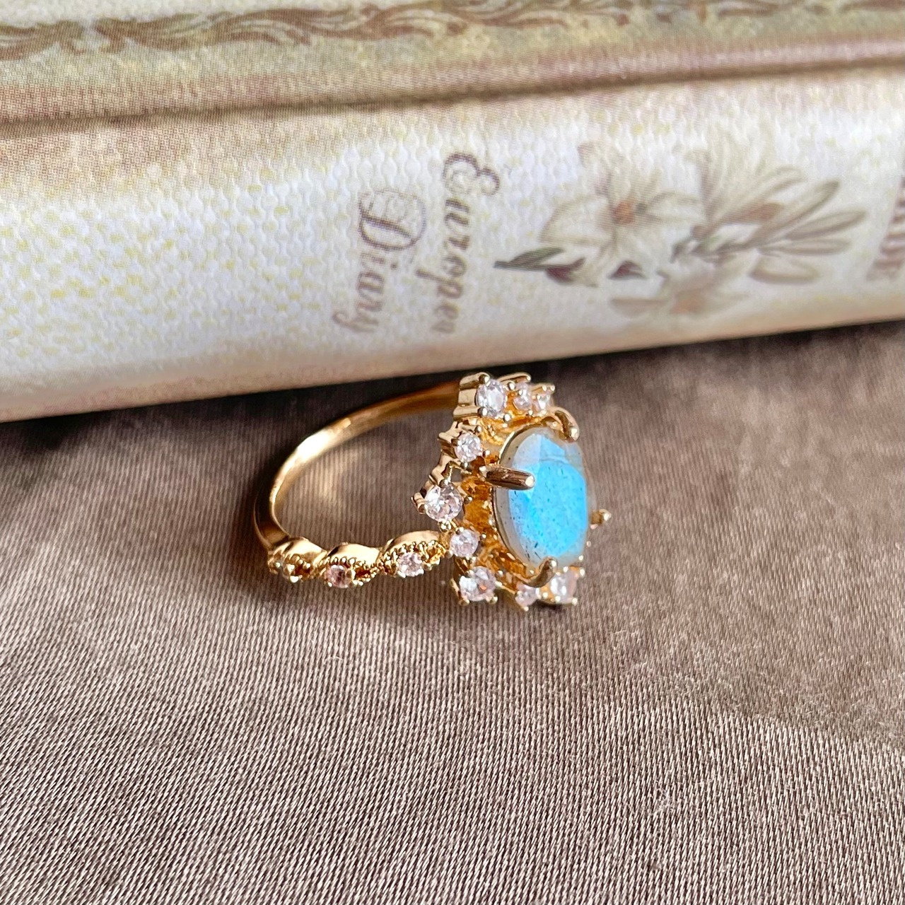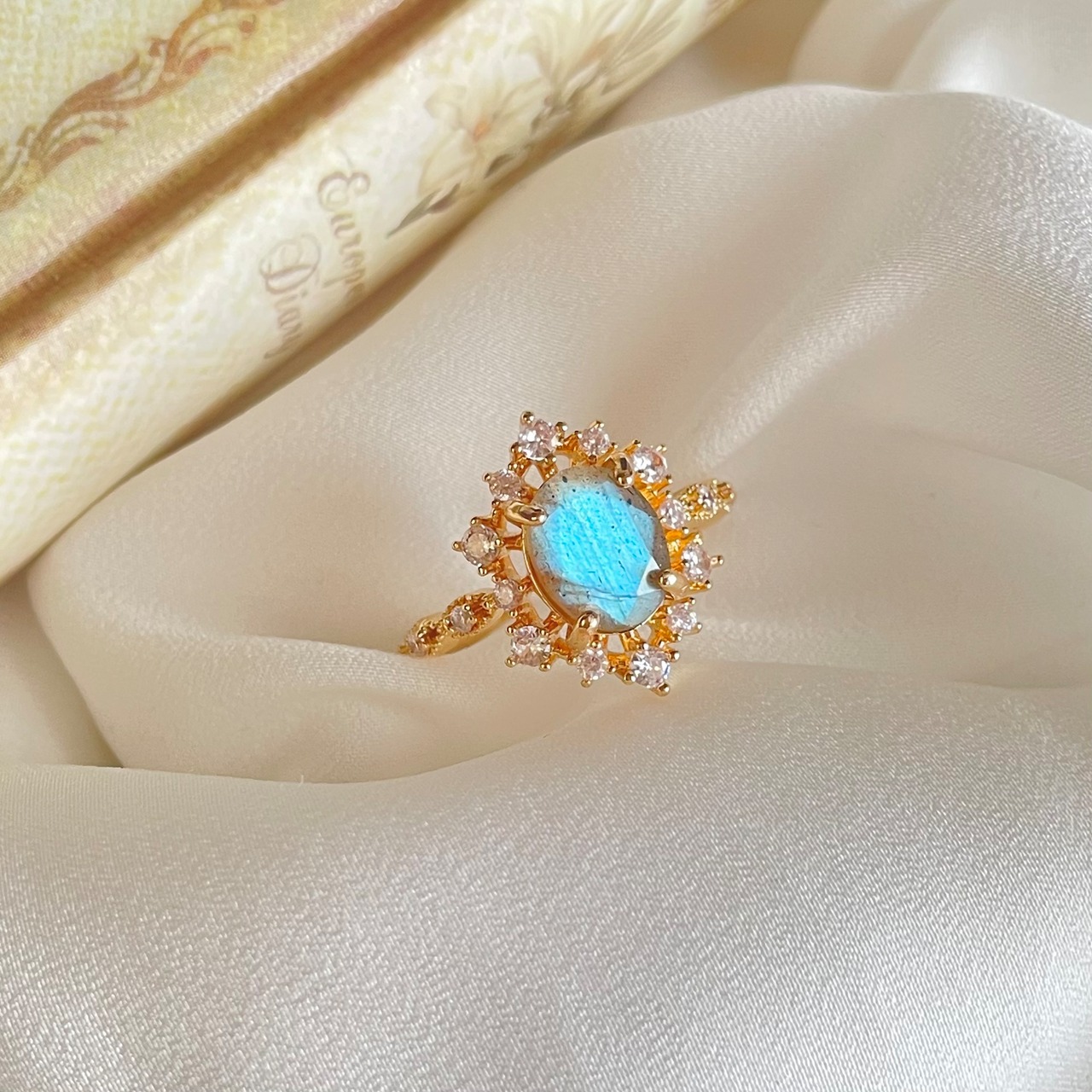 華やかなキュービックジルコニアがラブラドライトを囲み、指先を一瞬でエレガントに。