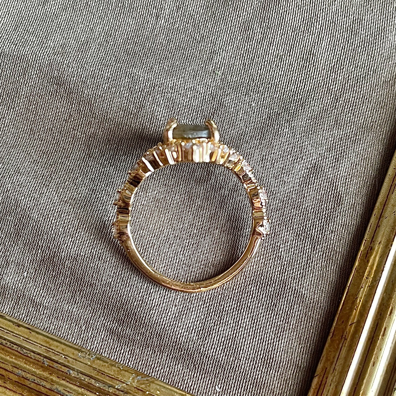 角度によって青い光が浮かびあがる、神秘的なラブラドライトを主役にしたリングです。