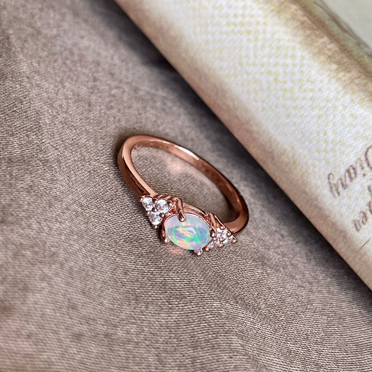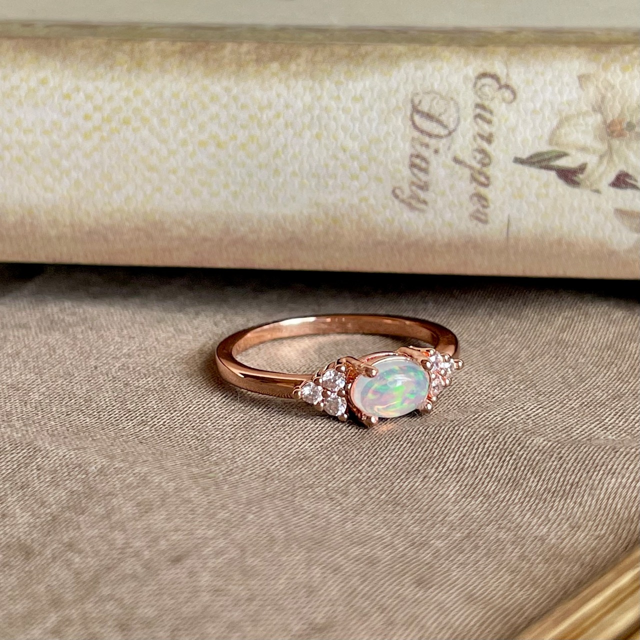 虹色の光を閉じ込めたように輝く、上質なオパールを主役にしたリング。