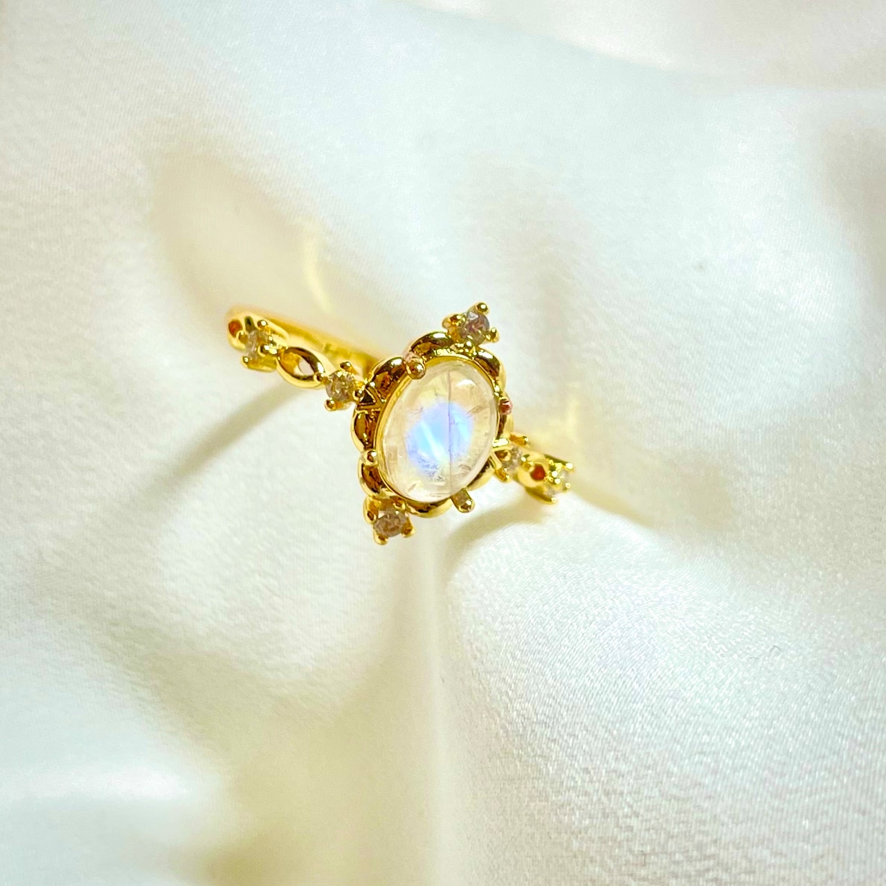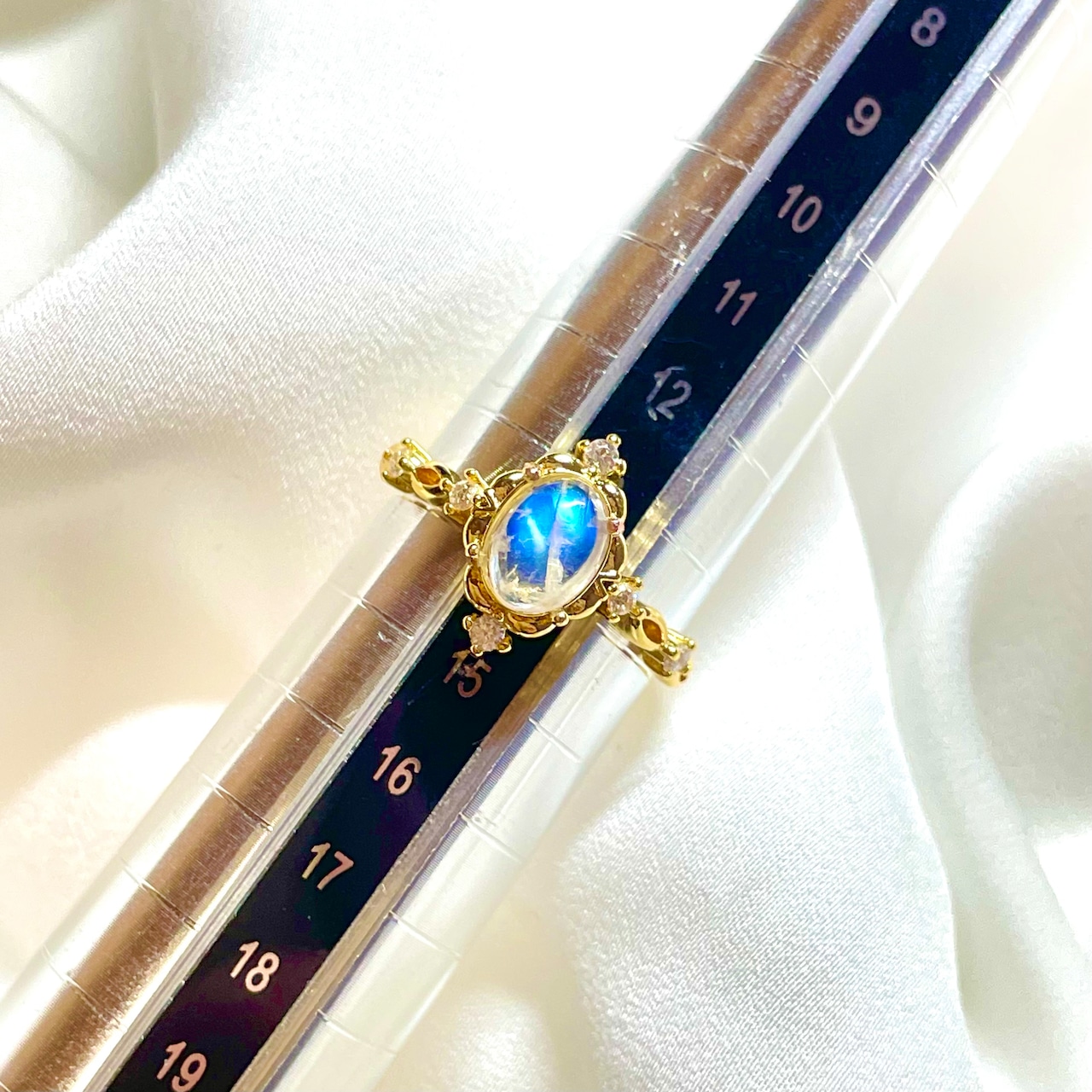 光の角度によってブルーのシラーがふわりと浮かび上がり、まるで月明かりを指先に宿したような幻想的な美しさを楽しめます。