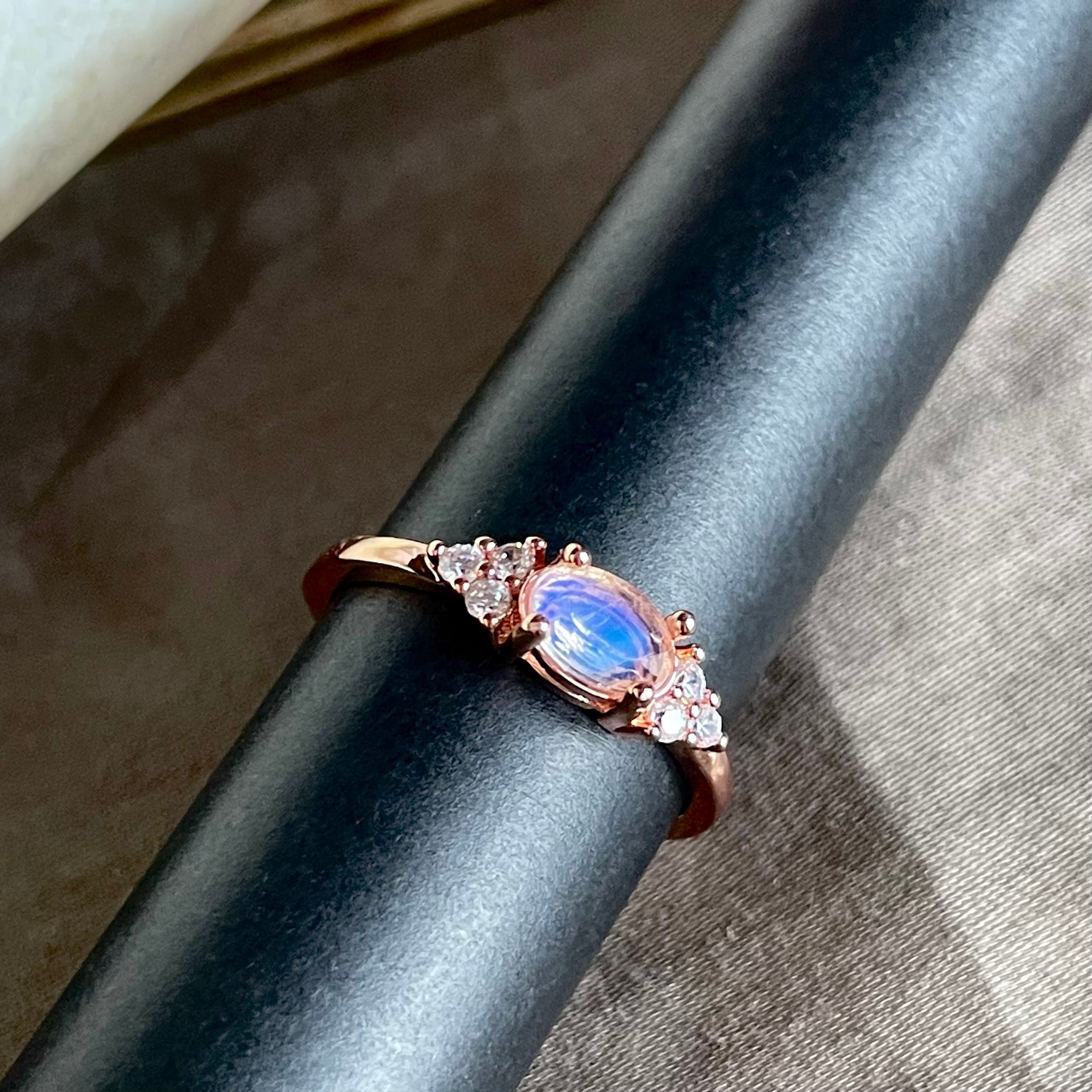 柔らかなローズゴールドの色味と、青く幻想的に光るブルームーンストーンが織りなす上品なリング。