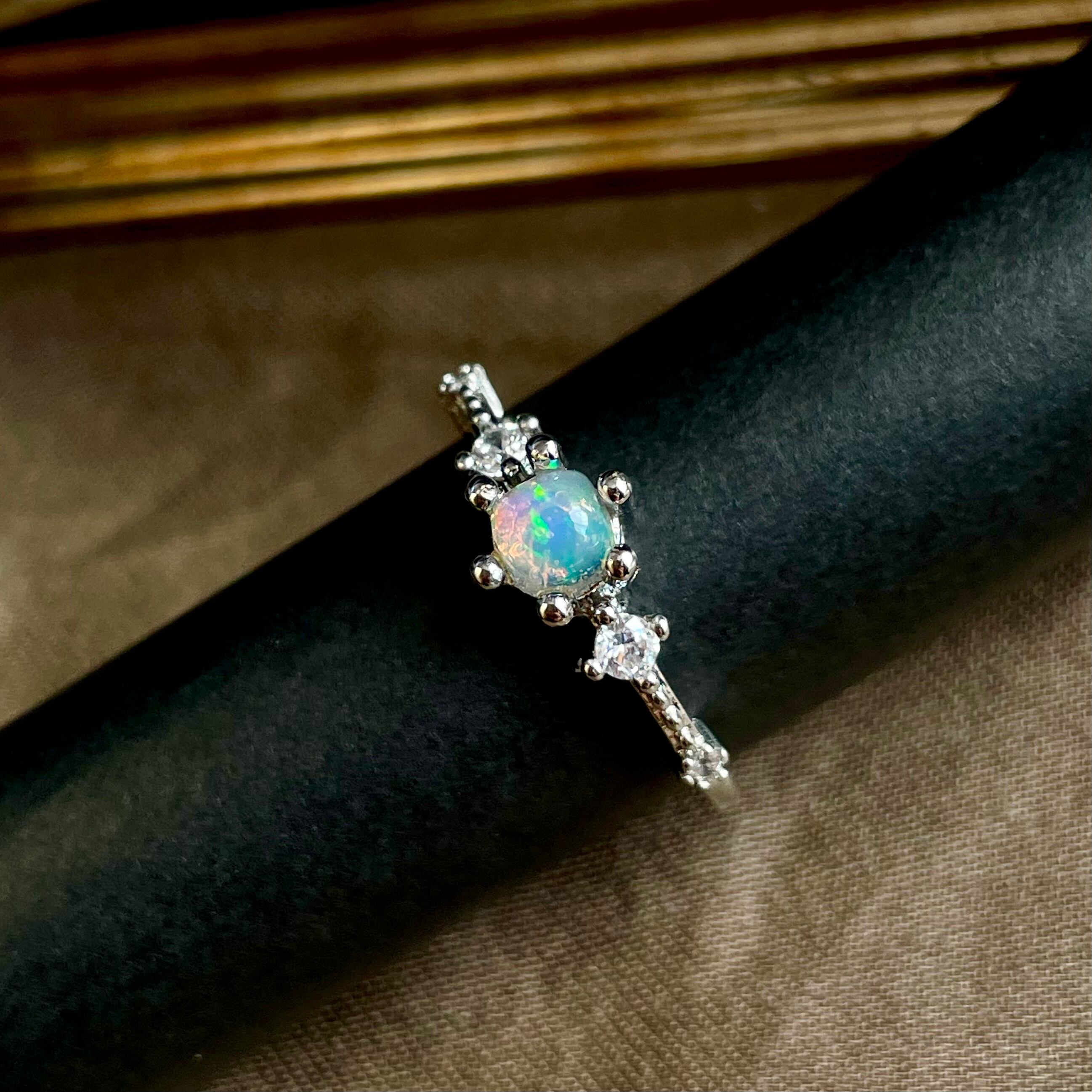 小ぶりながら、確かな存在感を放つレインボーオパールのリング。