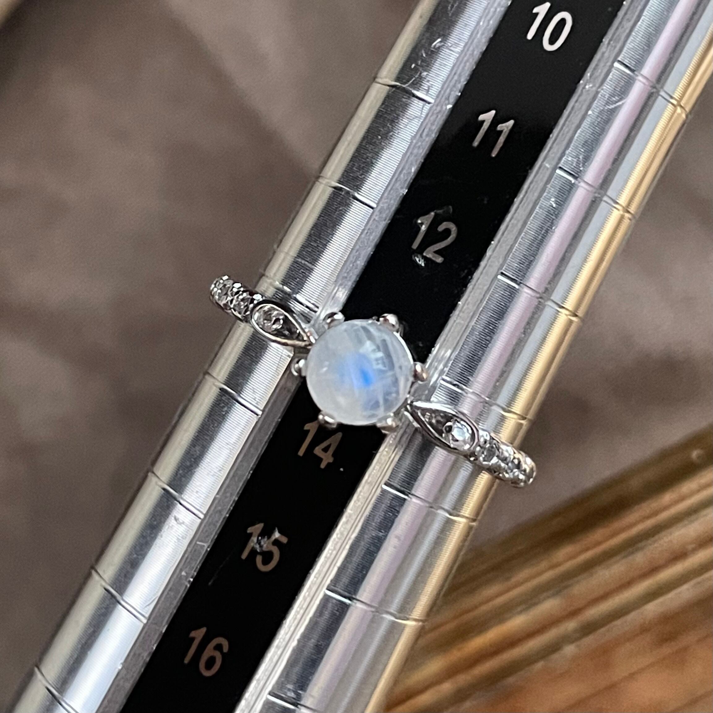 透明感のあるブルームーンストーンを中心に、繊細な装飾を施した華奢なデザインリング。