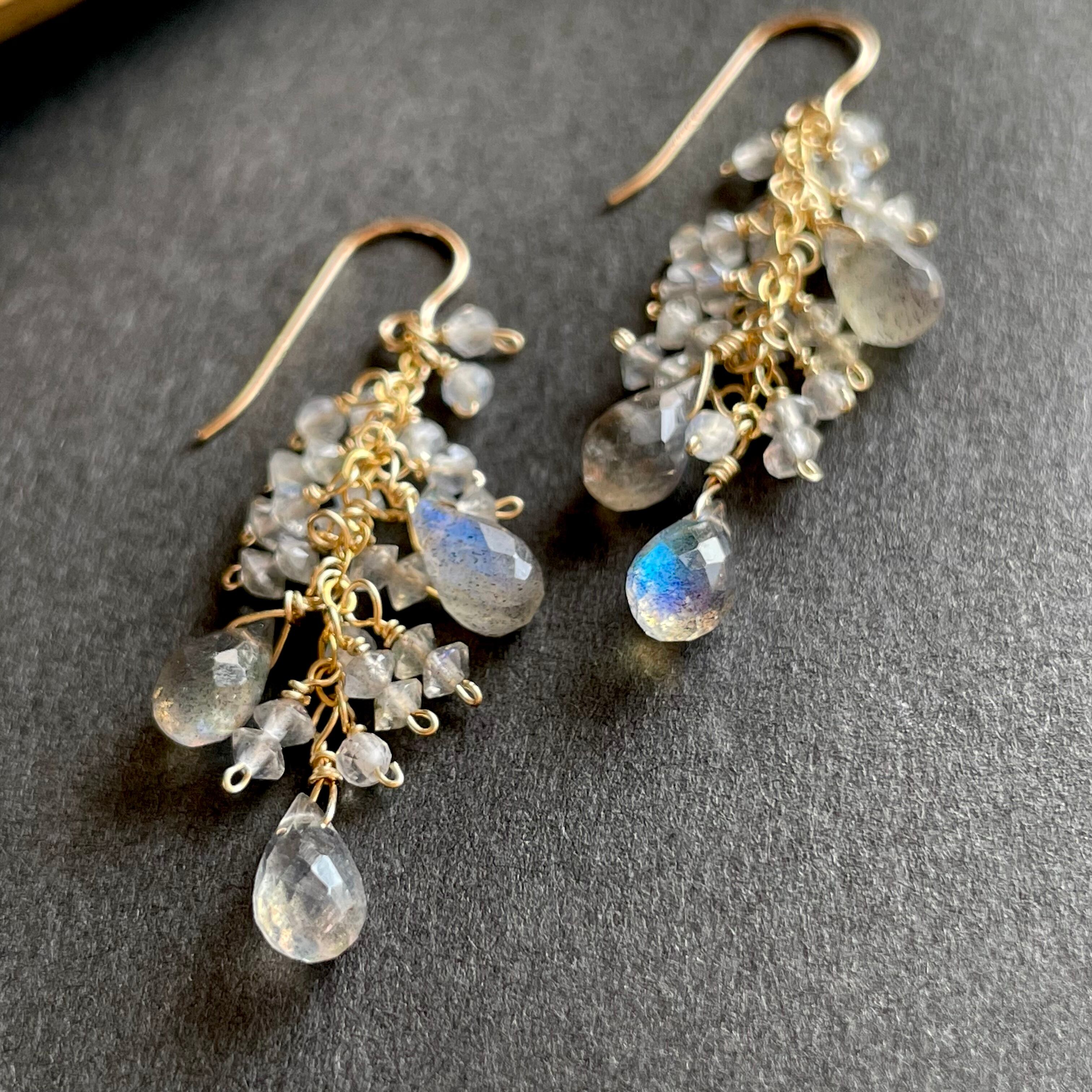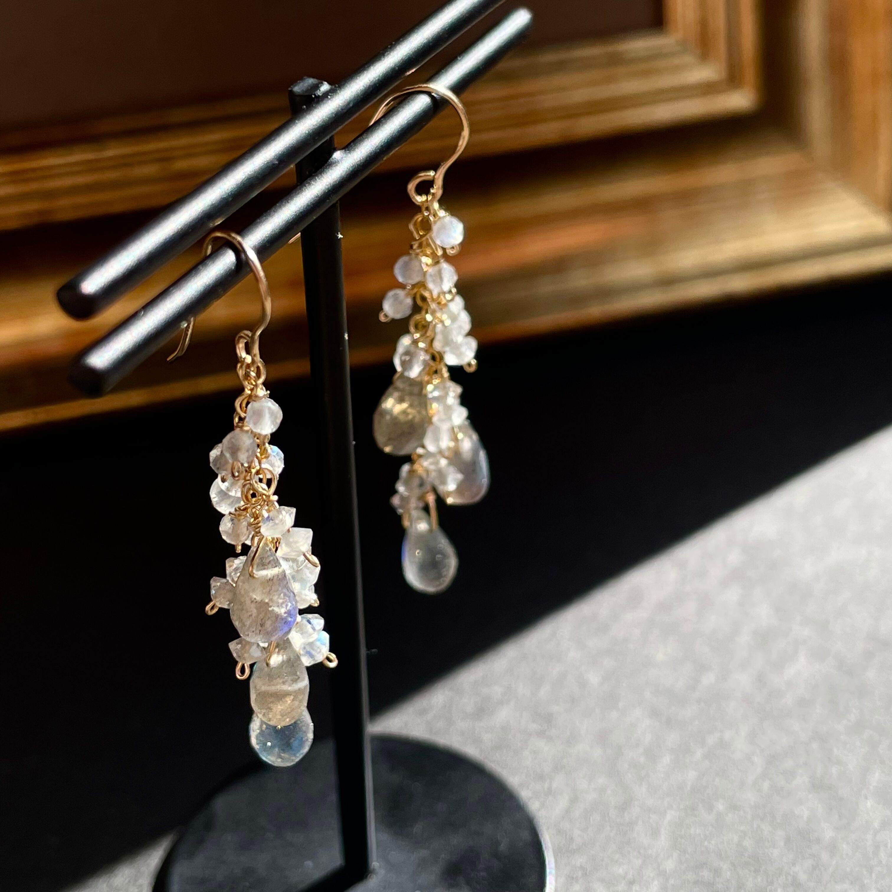 ソロバンビーズ、ラウンドカットビーズ、ドロップカットビーズと様々なラブラドライトを組み合わせたボリューム感あるピアスをお仕立て致しました。