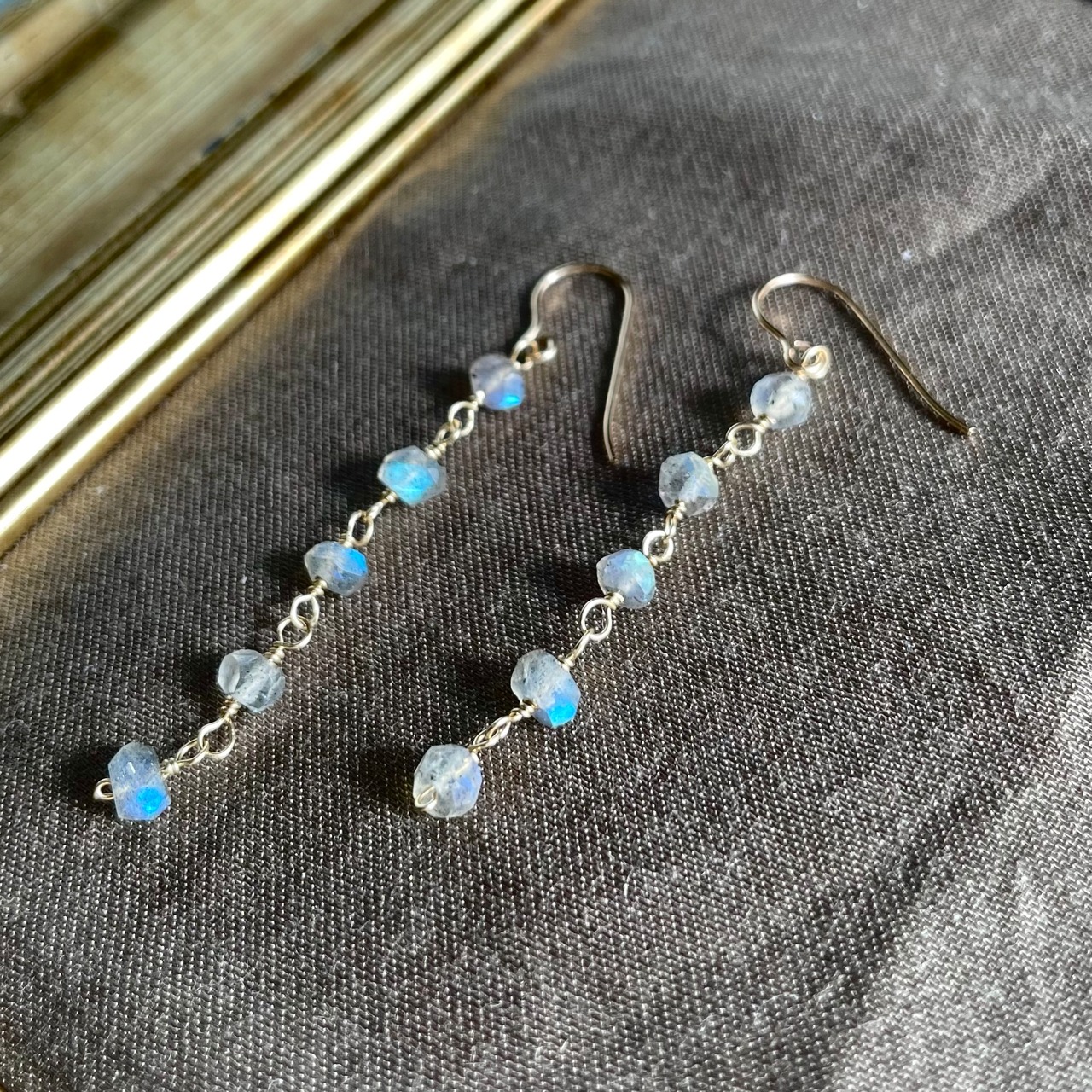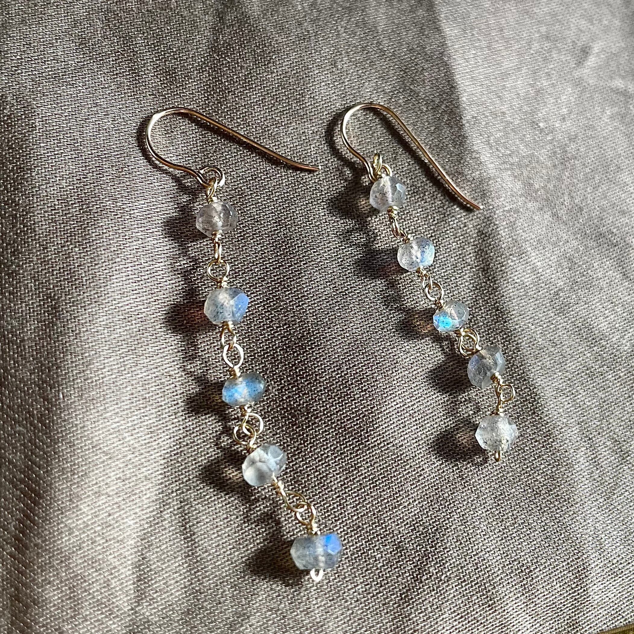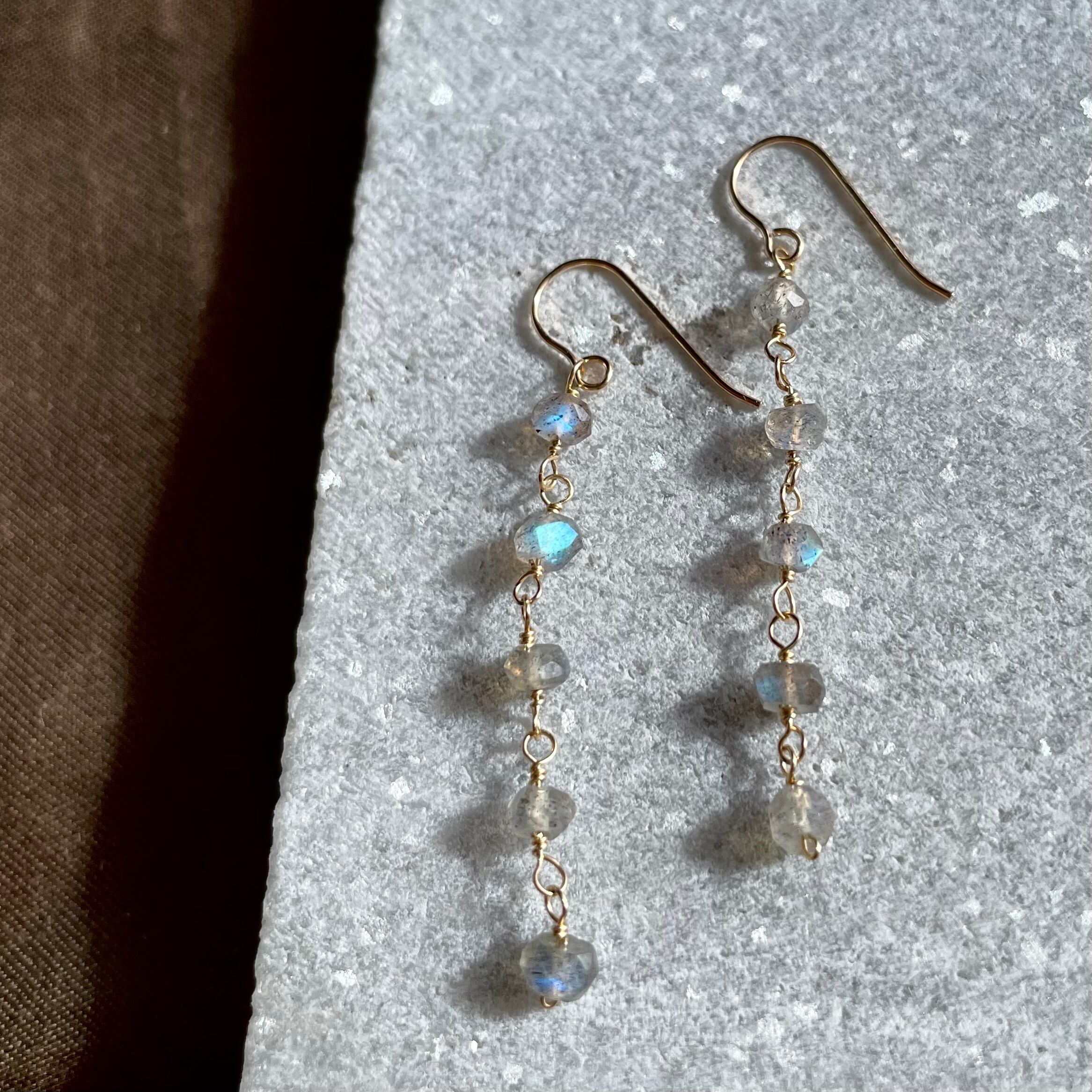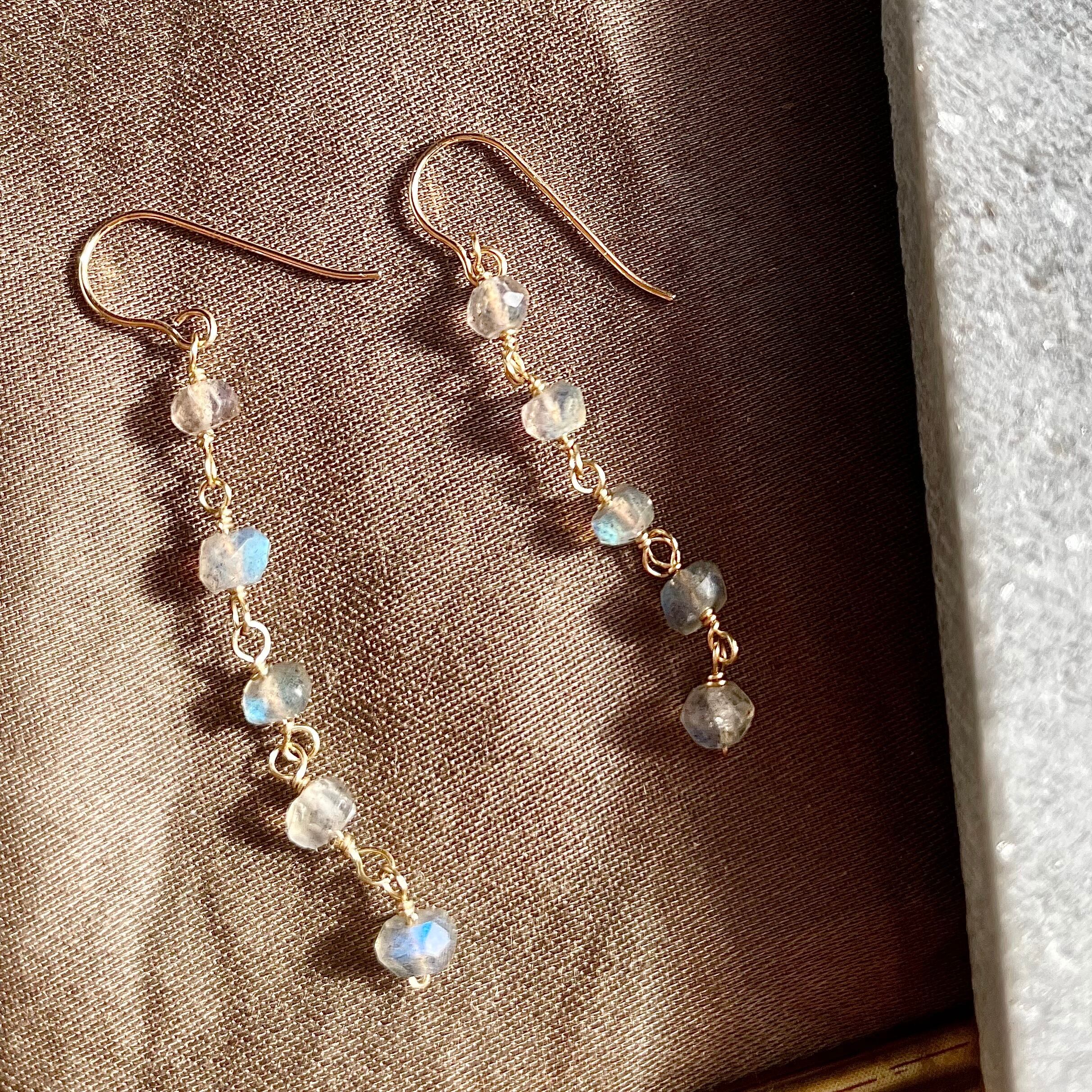 小さなボタンカットを5連にし、繊細なデザインながらもラブラドライトらしい様々なレッセンスを感じられるピアスにお仕立て致しました。