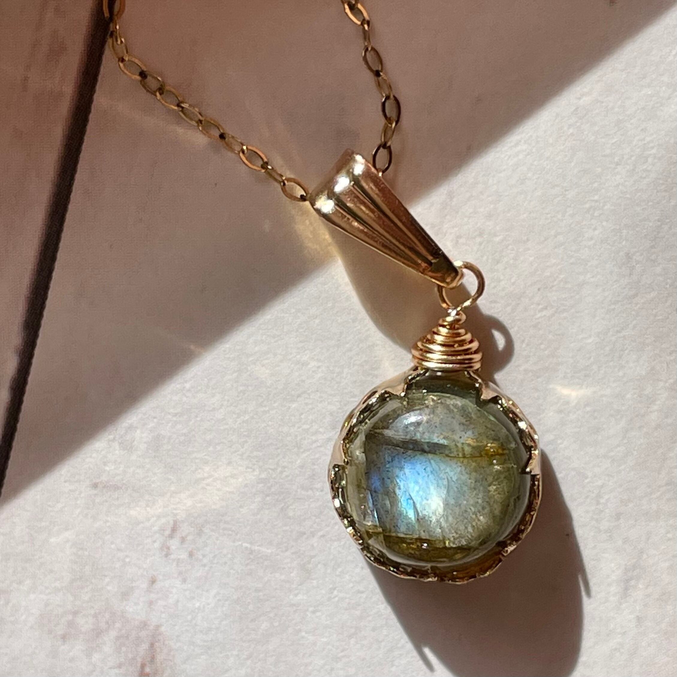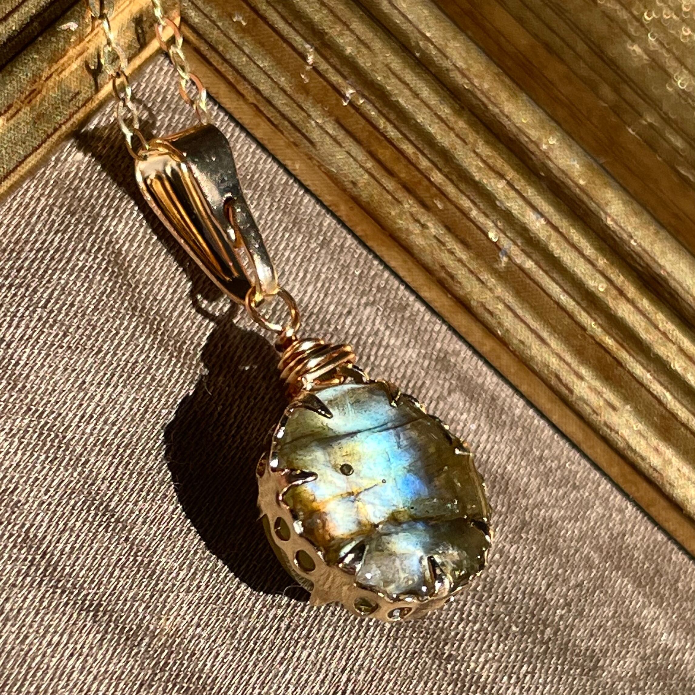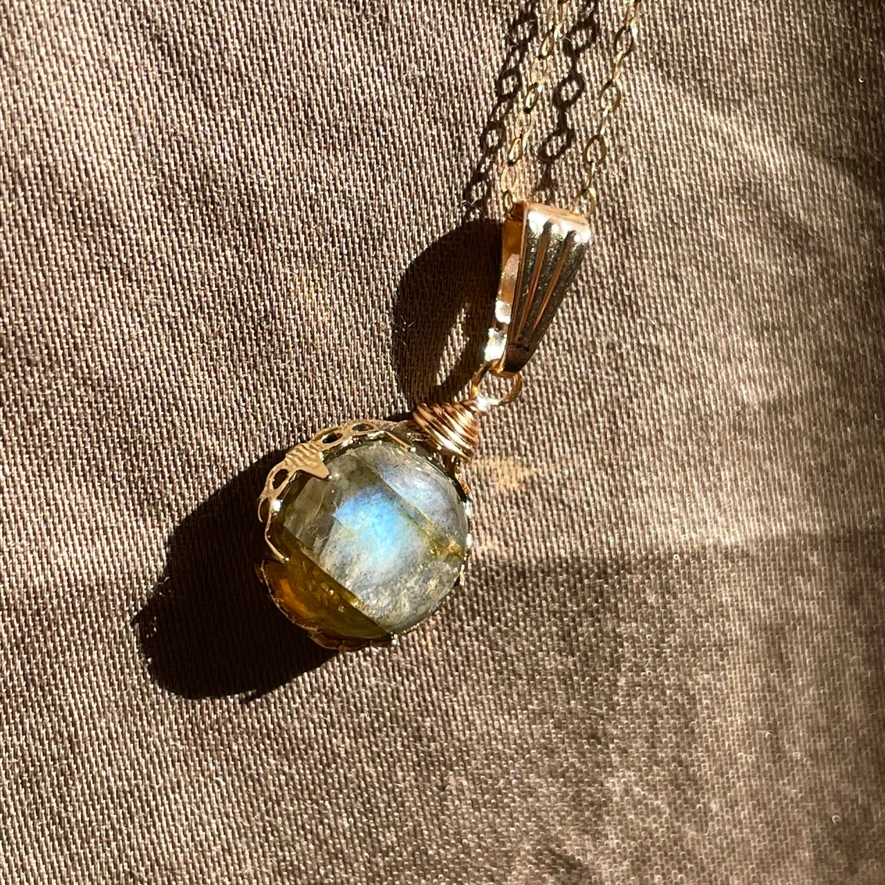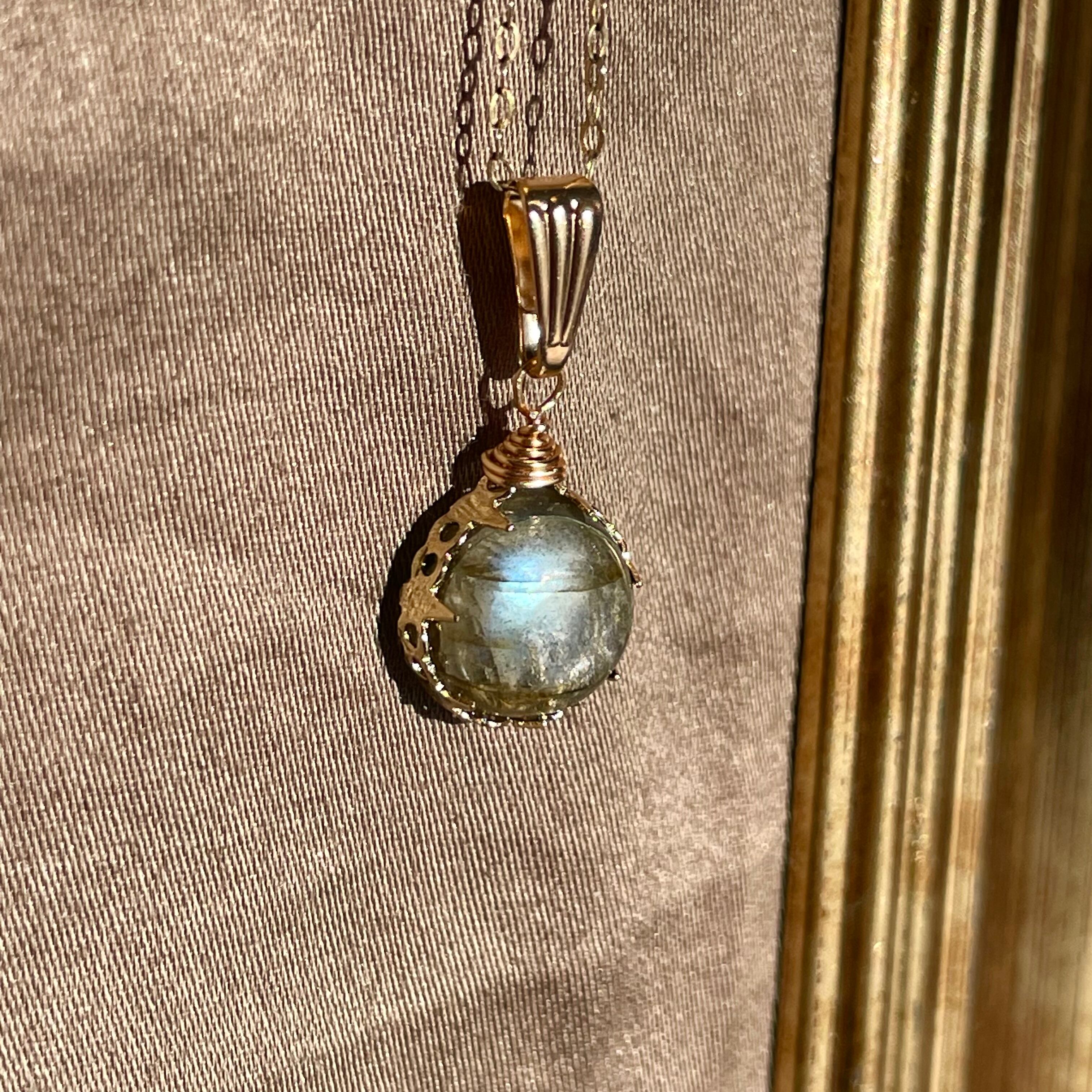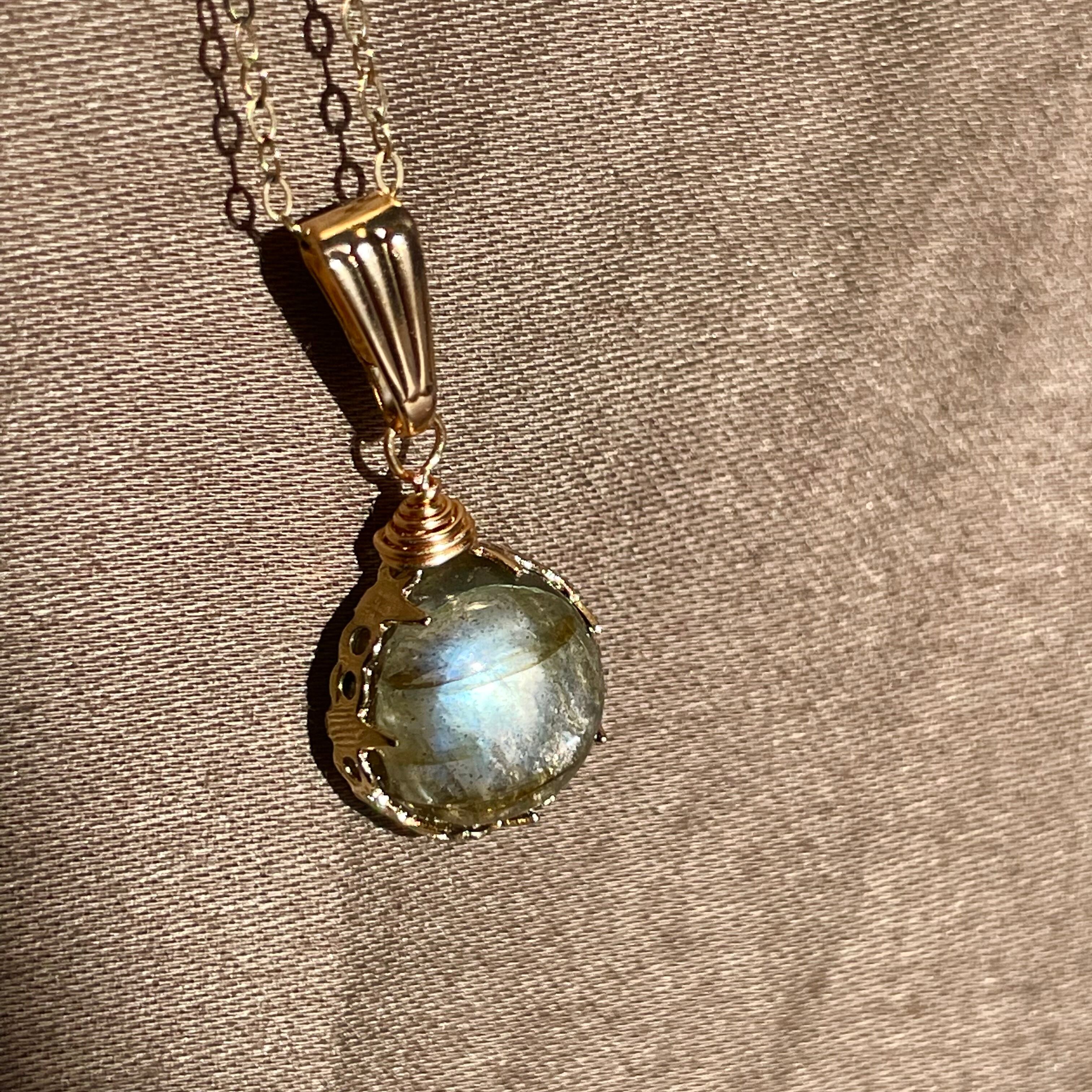 ペンダントトップを動かすとグリーンとイエローのレッセンスがきらりと天の川のように現れます。